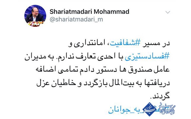 دستور شریعتمداری به مدیران عامل صندوق ها؛ تمامی اضافه دریافت ها به بیت المال بازگردد و خاطیان عزل گردند تاریخ : 28 فروردین 1398, 13:59 نویسنده : admin بازدیدها : 1228 نظرات : 0 موضوع : اخبار 0 "محمد شریعتمداری" وزیر تعاون، کار و رفاه اجتماعی طی توئیتی اعلام کرد: در مسیر شفافیت، امانتداری و فساد ستیزی با احدی تعارف ندارم. به مدیران عامل صندوق ها دستور دادم تمامی اضافه دریافت ها به بیت المال بازگردد و خاطیان عزل گردند. کلید واژه ها : شریعتمداری وزیر تعاون، کار و رفاه اجتماعی شفافیت امانتداری فساد ستیزی بیت المال